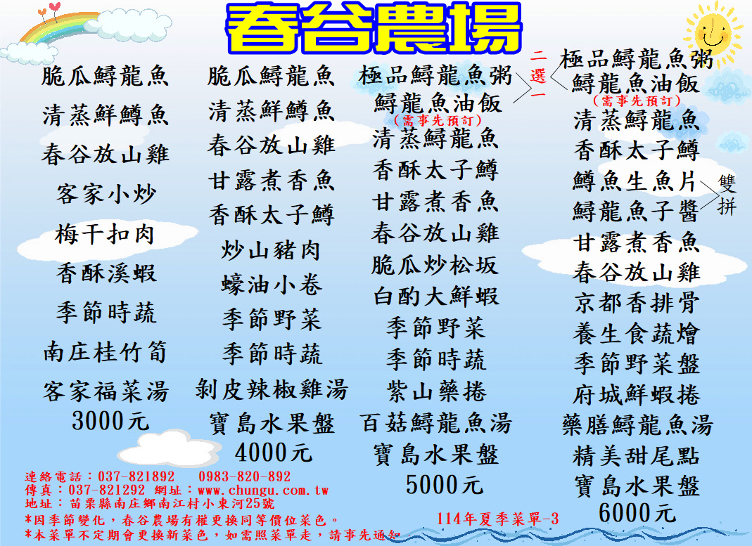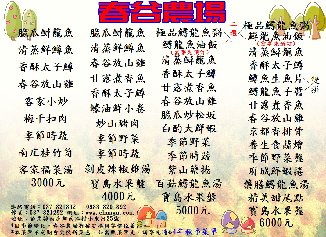 運用南庄春谷農場養殖的鱒魚及鱘龍魚,搭配南庄客家食材藉由廚師的巧手,將美味的料理呈現給饕客們!既然來到南庄,一定要來南庄春谷農場品嘗道地美味佳餚。菜單內容會依季節變換而稍微調整。