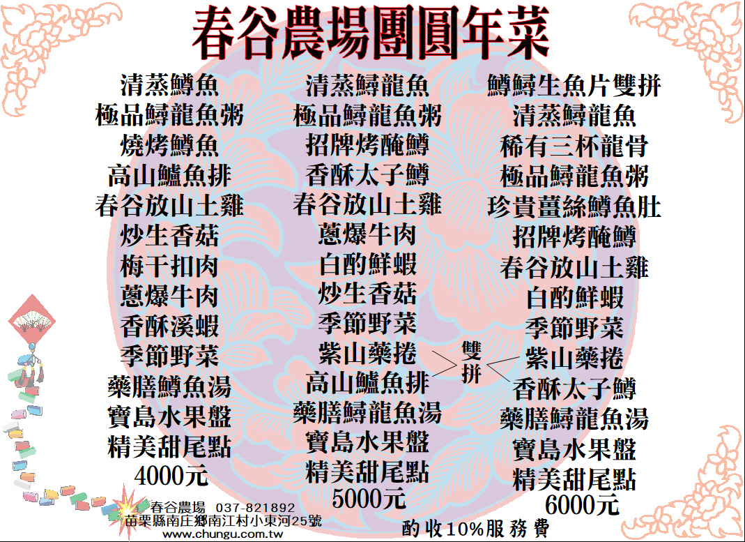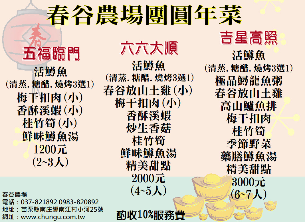 不同以往,今年年菜特別推出唯有春谷農場才能品嘗到的頂級菜色!敬邀闔家一同來嘗鮮!